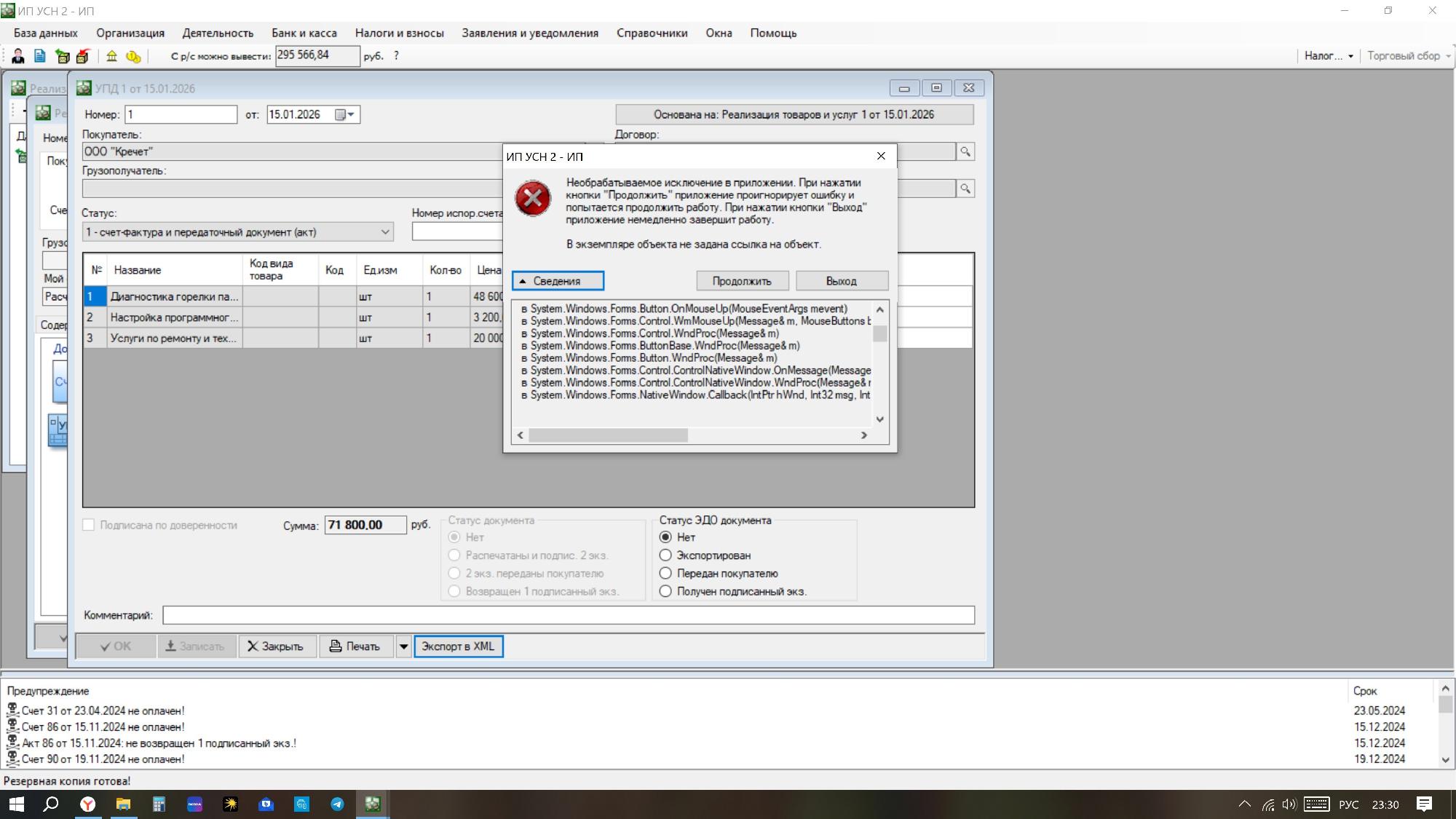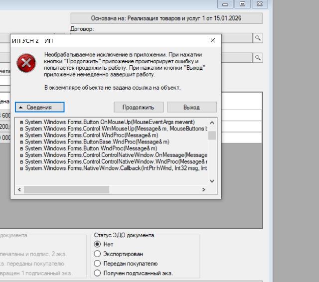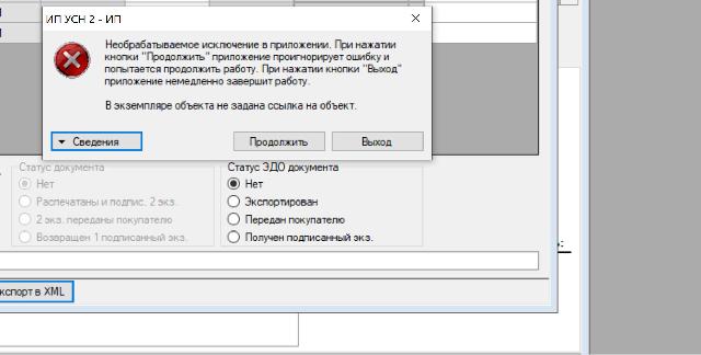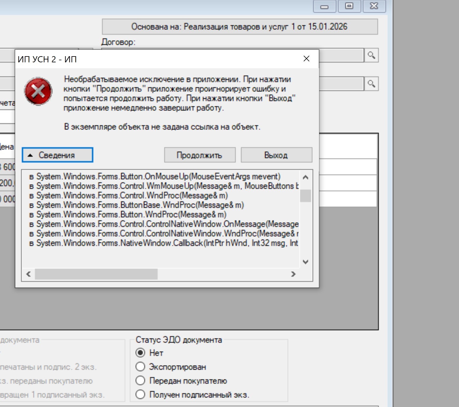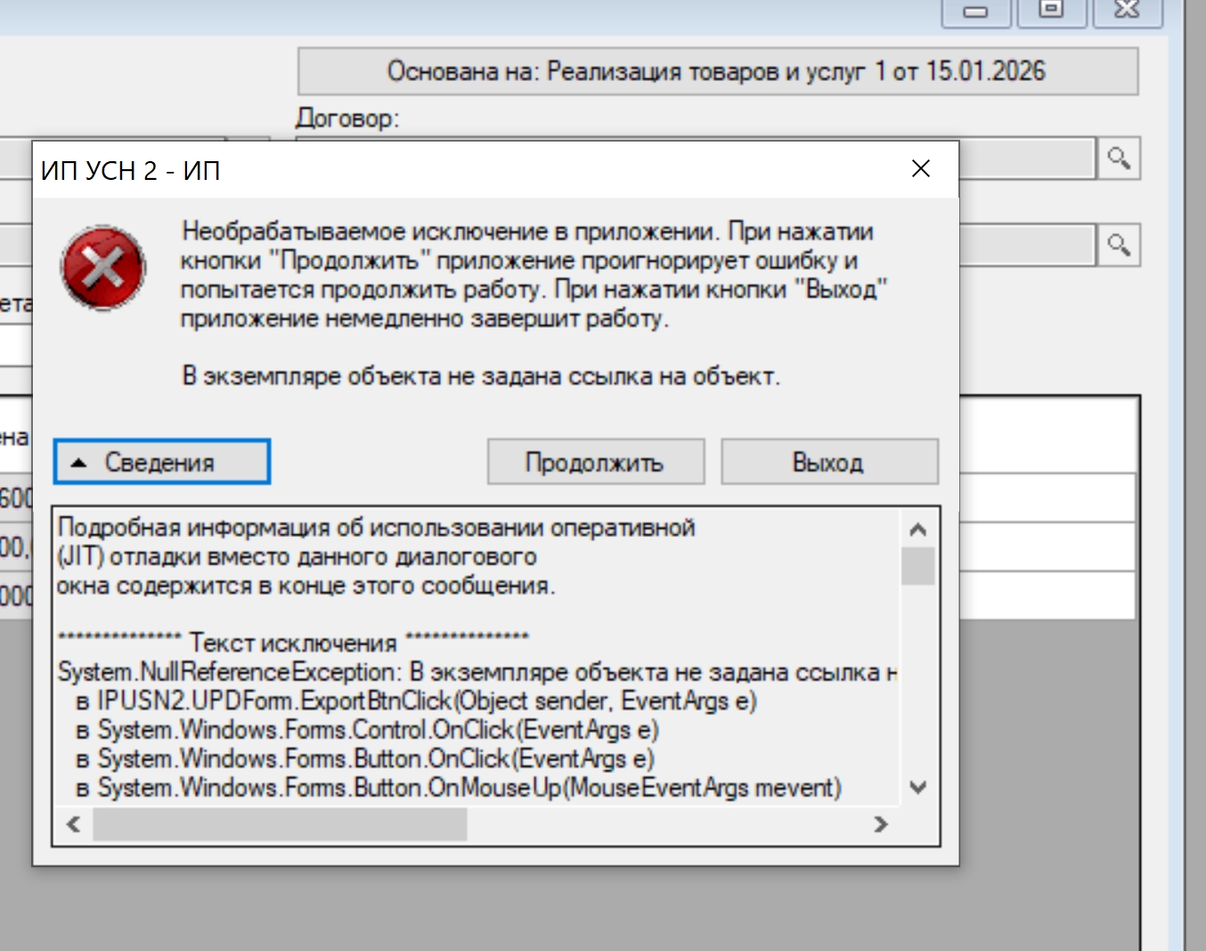 | | Добрый день! При попытке экспортировать УПД выходит сообщение о какой то ошибке. Подскажите пожалуйста, как исправить? В декабре 2025 всё работало отлично.